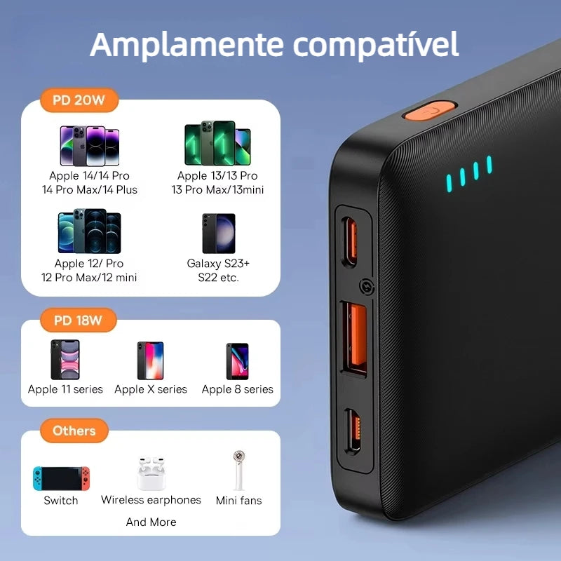 ✅ Potência real de 10.000mAh / 74Wh – energia suficiente para múltiplas recargas.